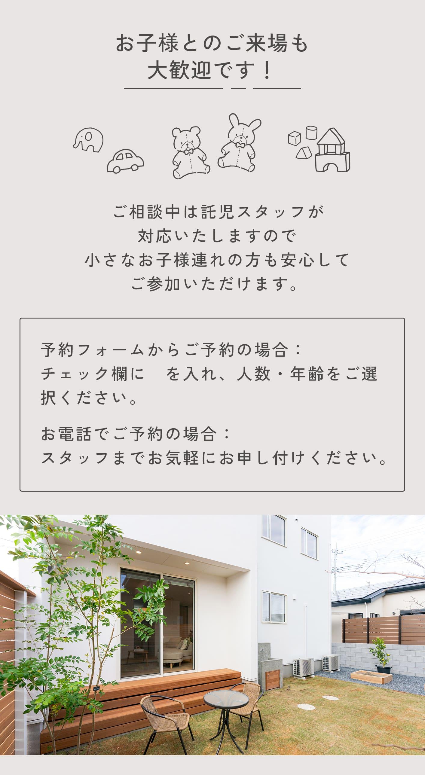 完全予約制 先着順 各回1組様限定 枠に限りがございますので、ご希望の方はお早めにご予約ください。 ※満席になり次第受付終了となります。 ※保育希望の場合はご予約時にお申し込みください。 |
